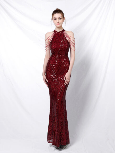 Backless Evening Dress Women Party Dress Long Wear Sequin Fabric Cheap